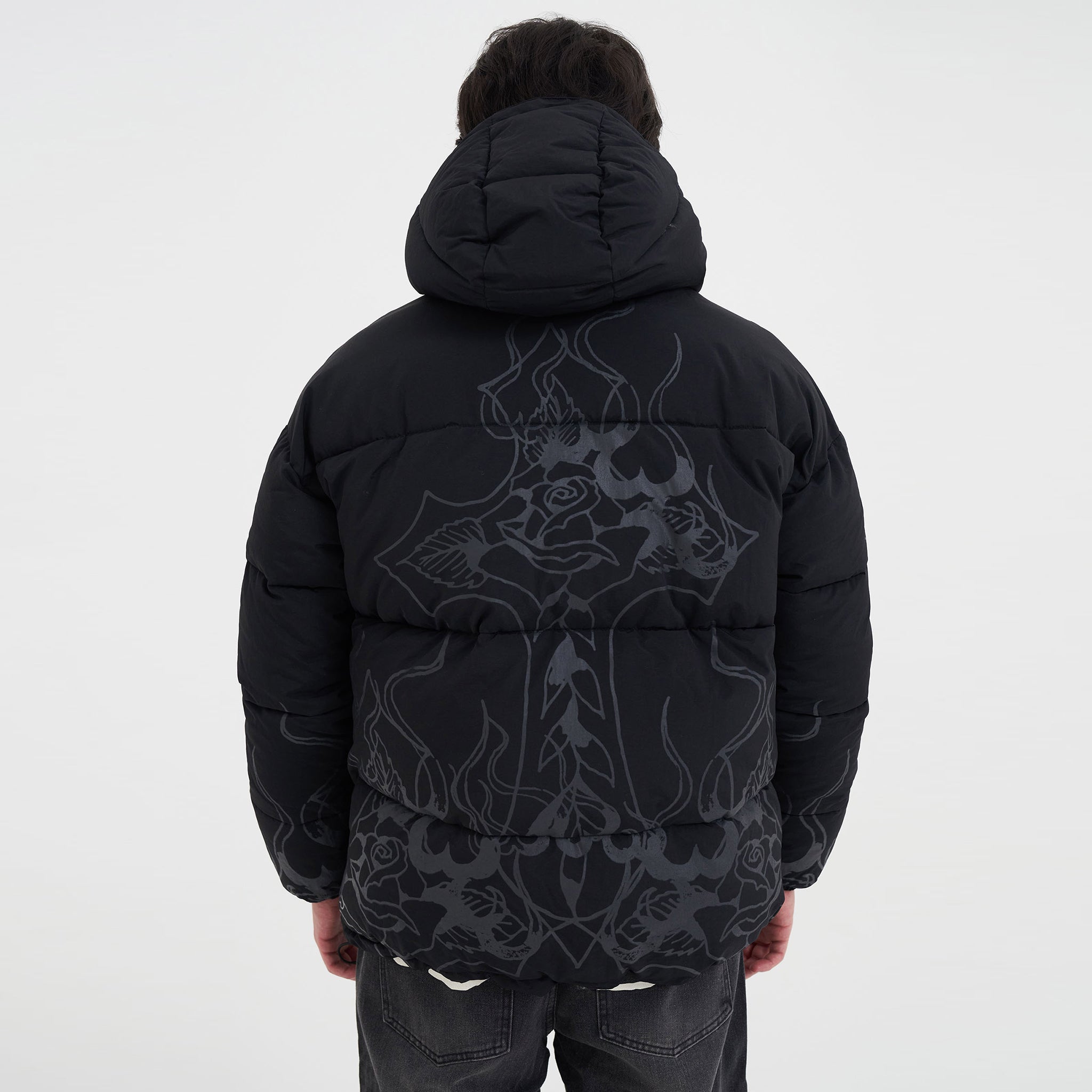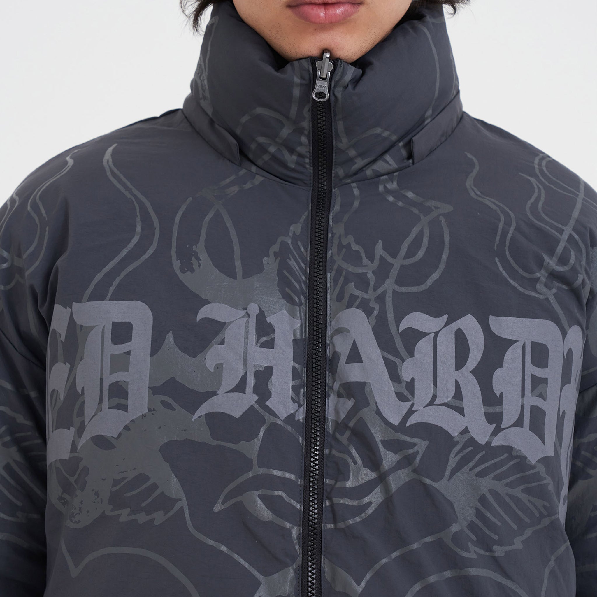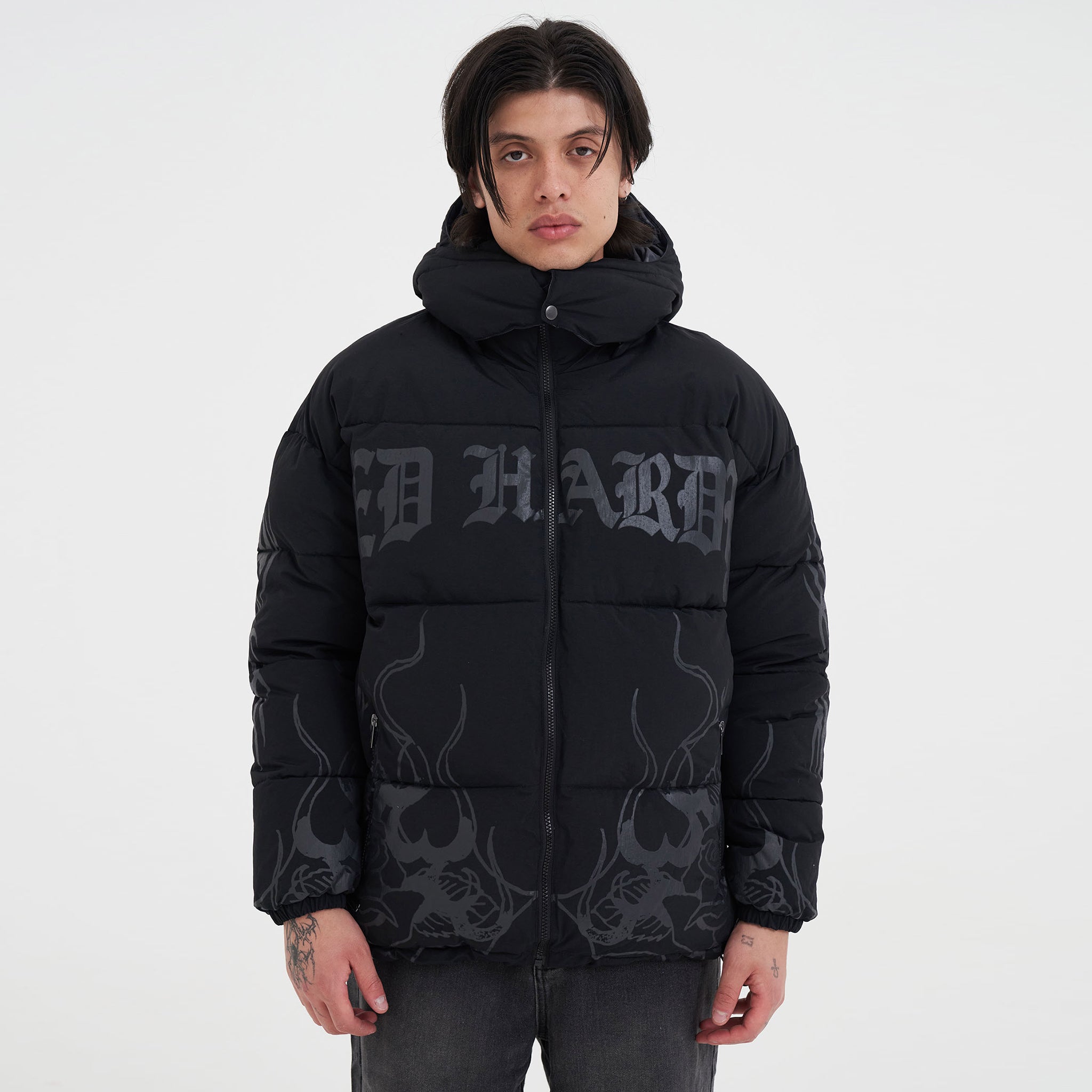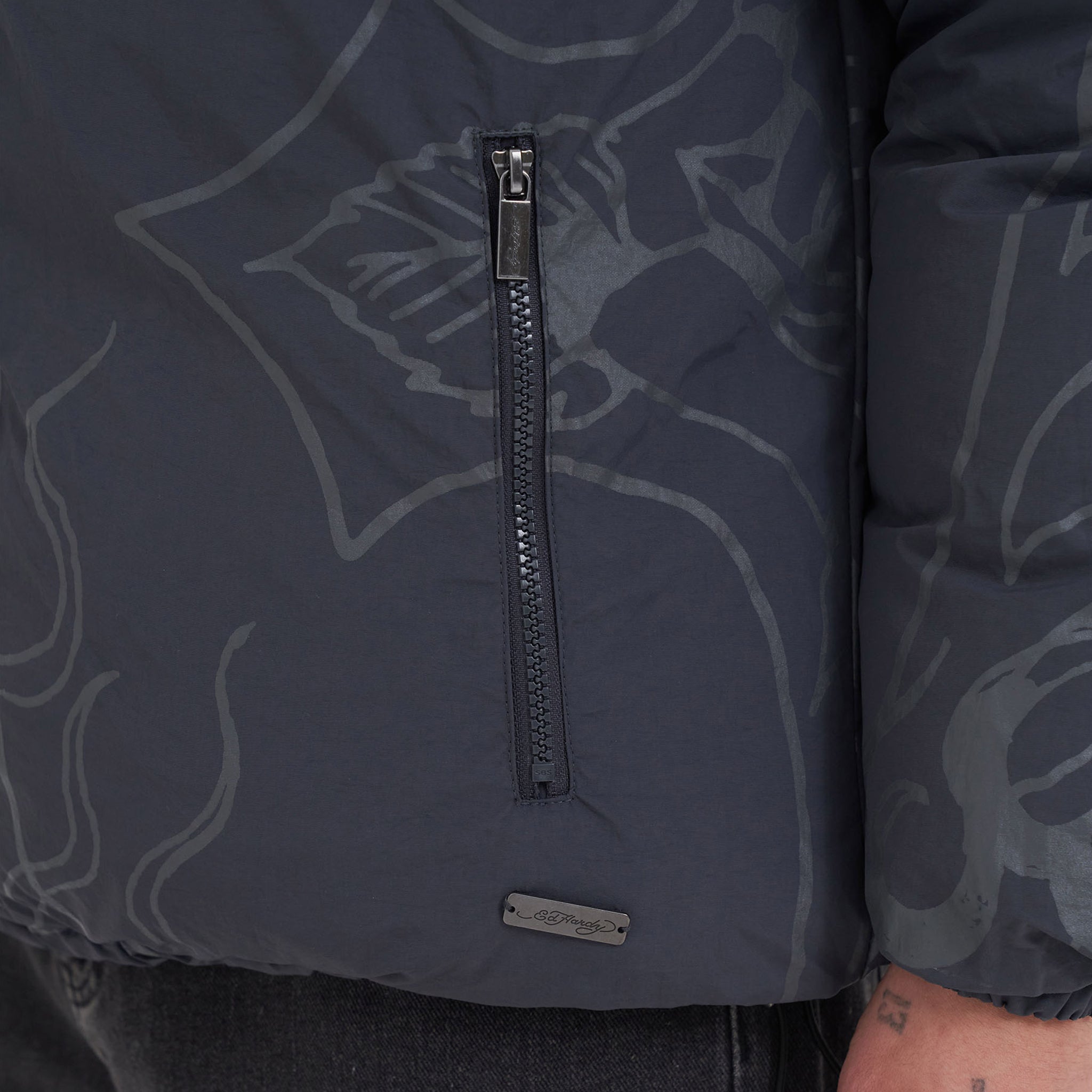 Embrace versatility with the Flaming Rose Reversible Puffer Jacket in black. Designed for comfort and function, it features a reversible design, removable hood, and heavy-weight wadding for warmth. Adjustable elasticated hem and cuffs ensure a secure fit, while the Ed Hardy printed tattoo graphics add unique style. Crafted from durable nylon with polyester padding, this relaxed-fit coat combines practicality with bold fashion for your everyday needs.