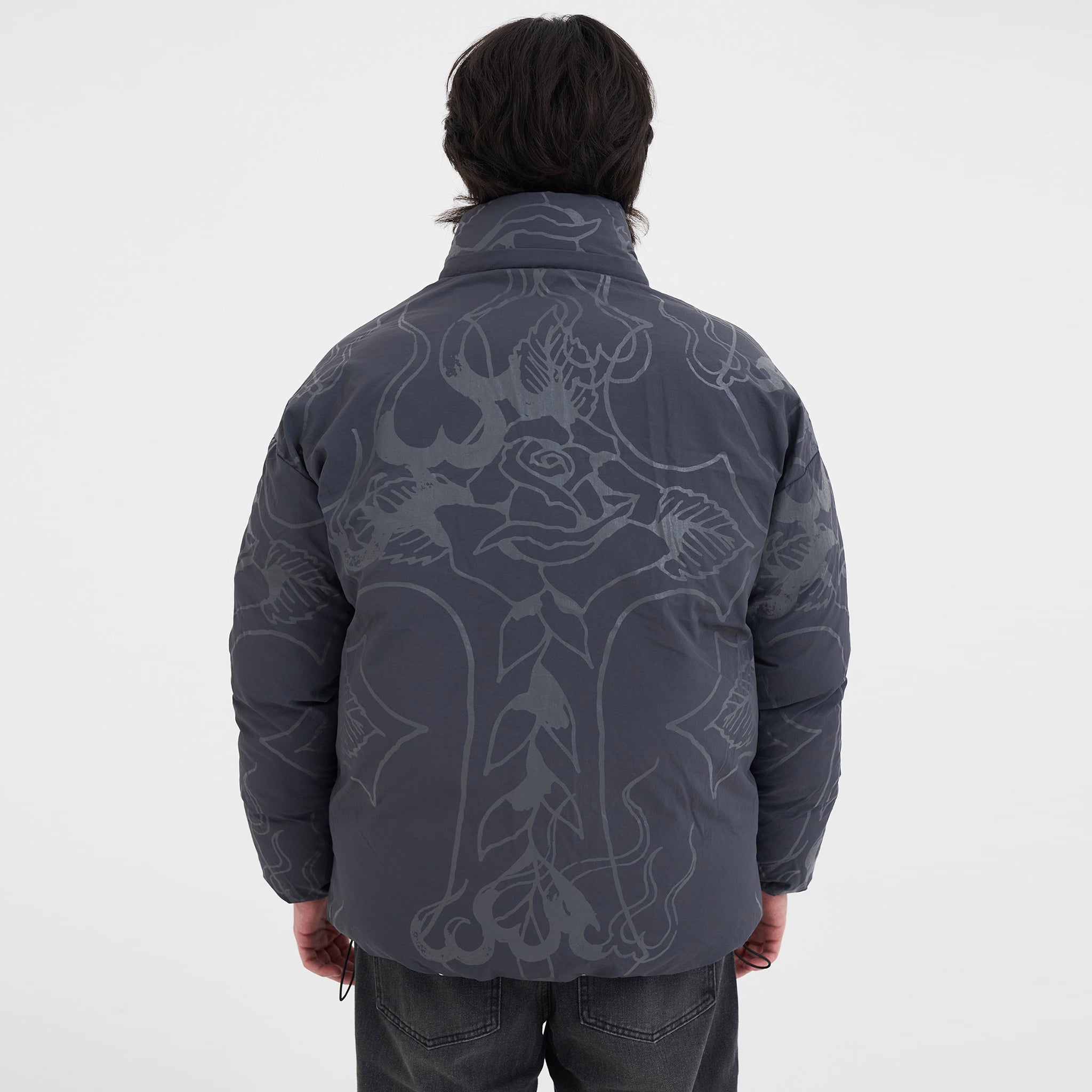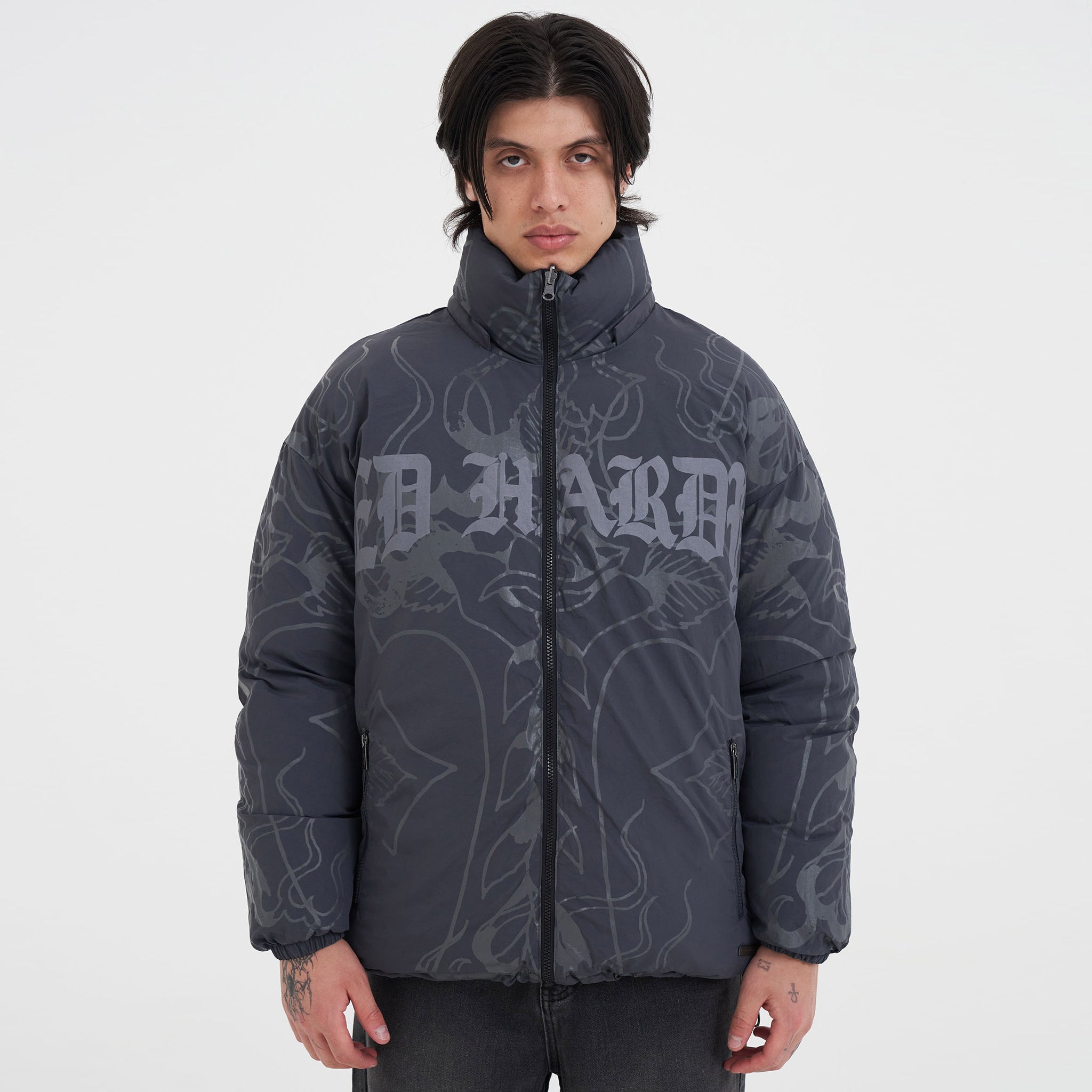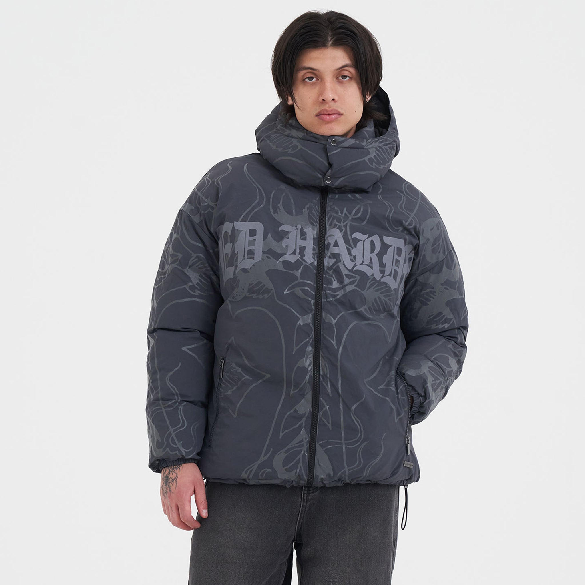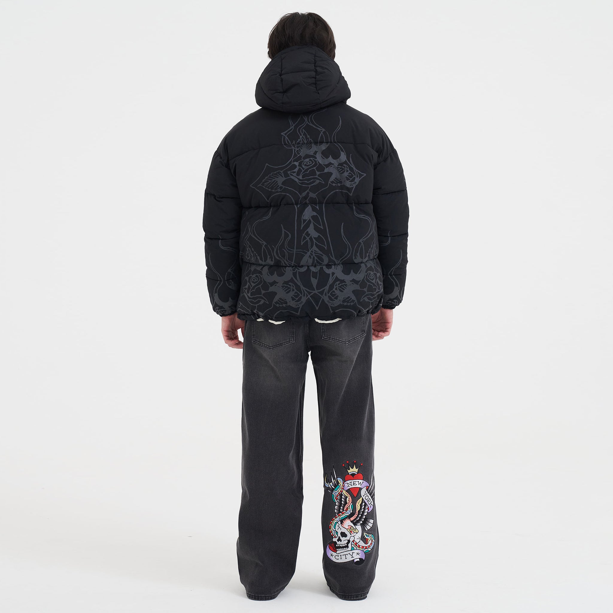 Embrace versatility with the Flaming Rose Reversible Puffer Jacket in black. Designed for comfort and function, it features a reversible design, removable hood, and heavy-weight wadding for warmth. Adjustable elasticated hem and cuffs ensure a secure fit, while the Ed Hardy printed tattoo graphics add unique style. Crafted from durable nylon with polyester padding, this relaxed-fit coat combines practicality with bold fashion for your everyday needs.