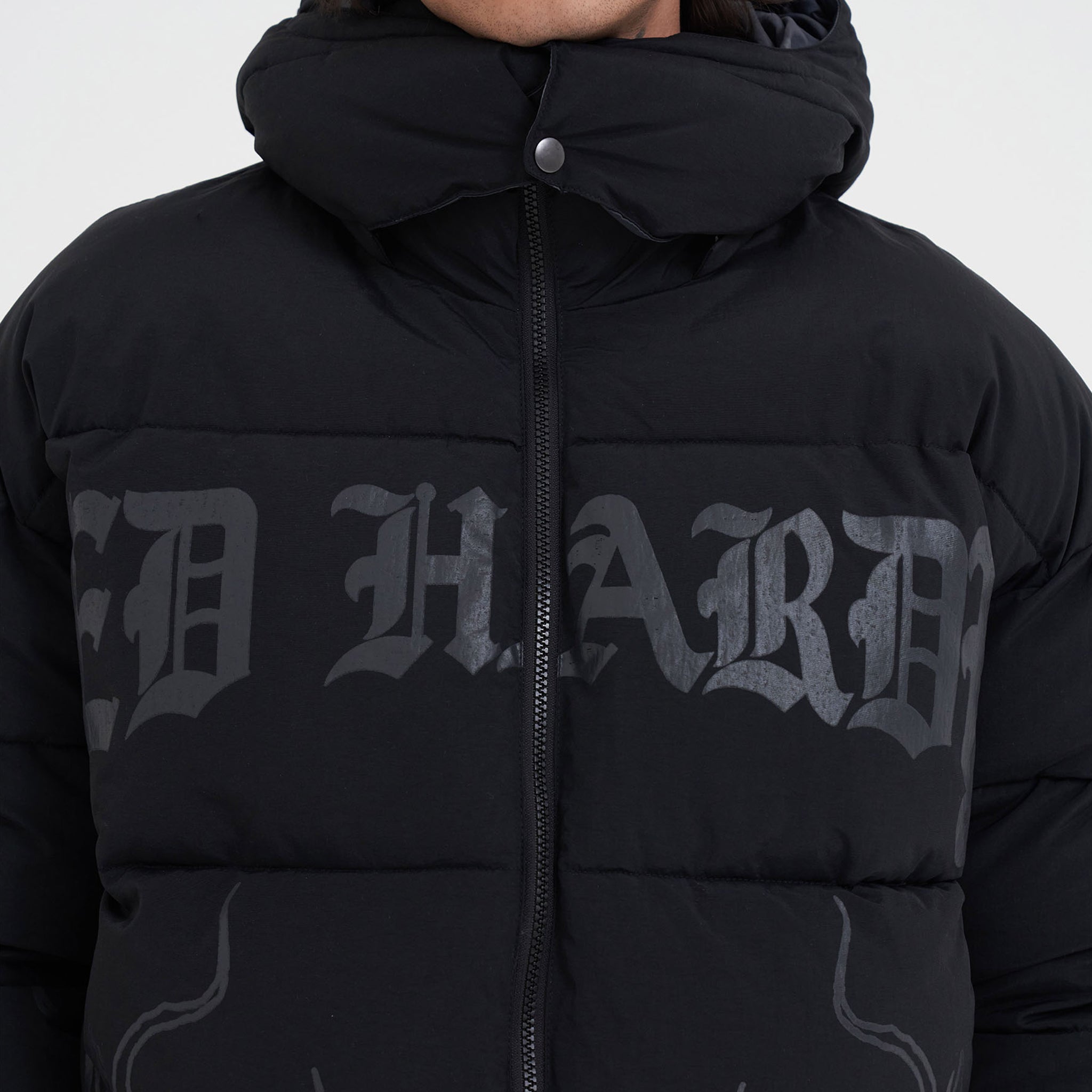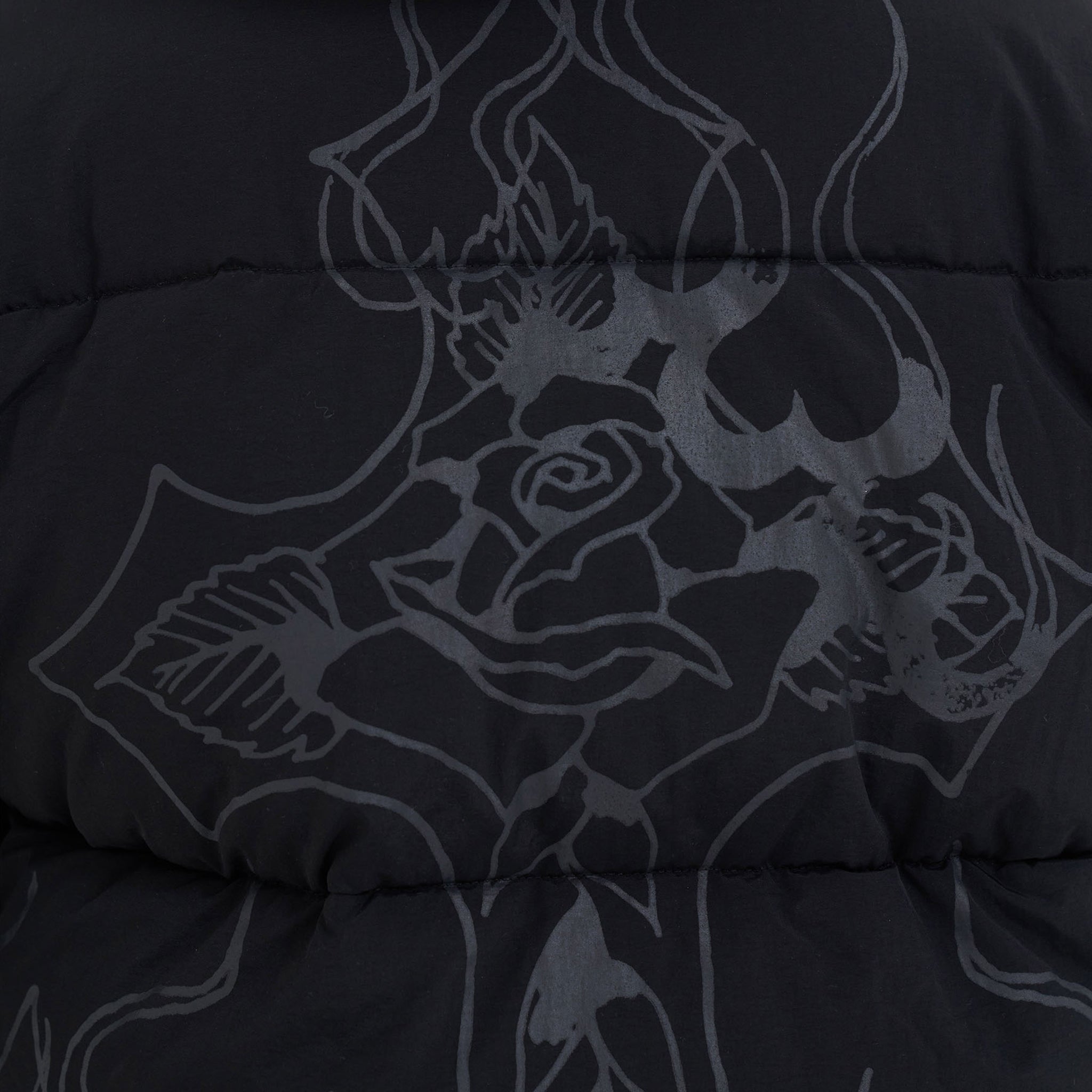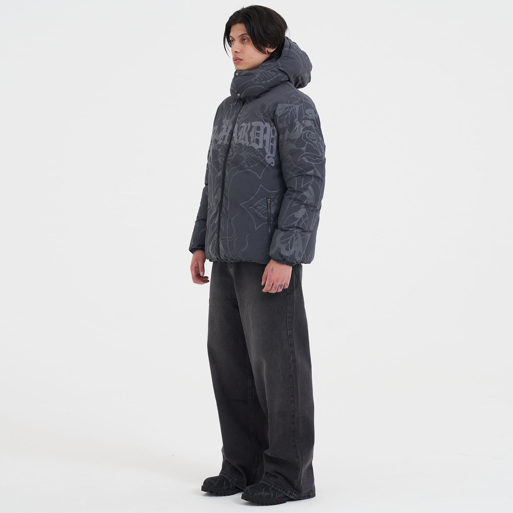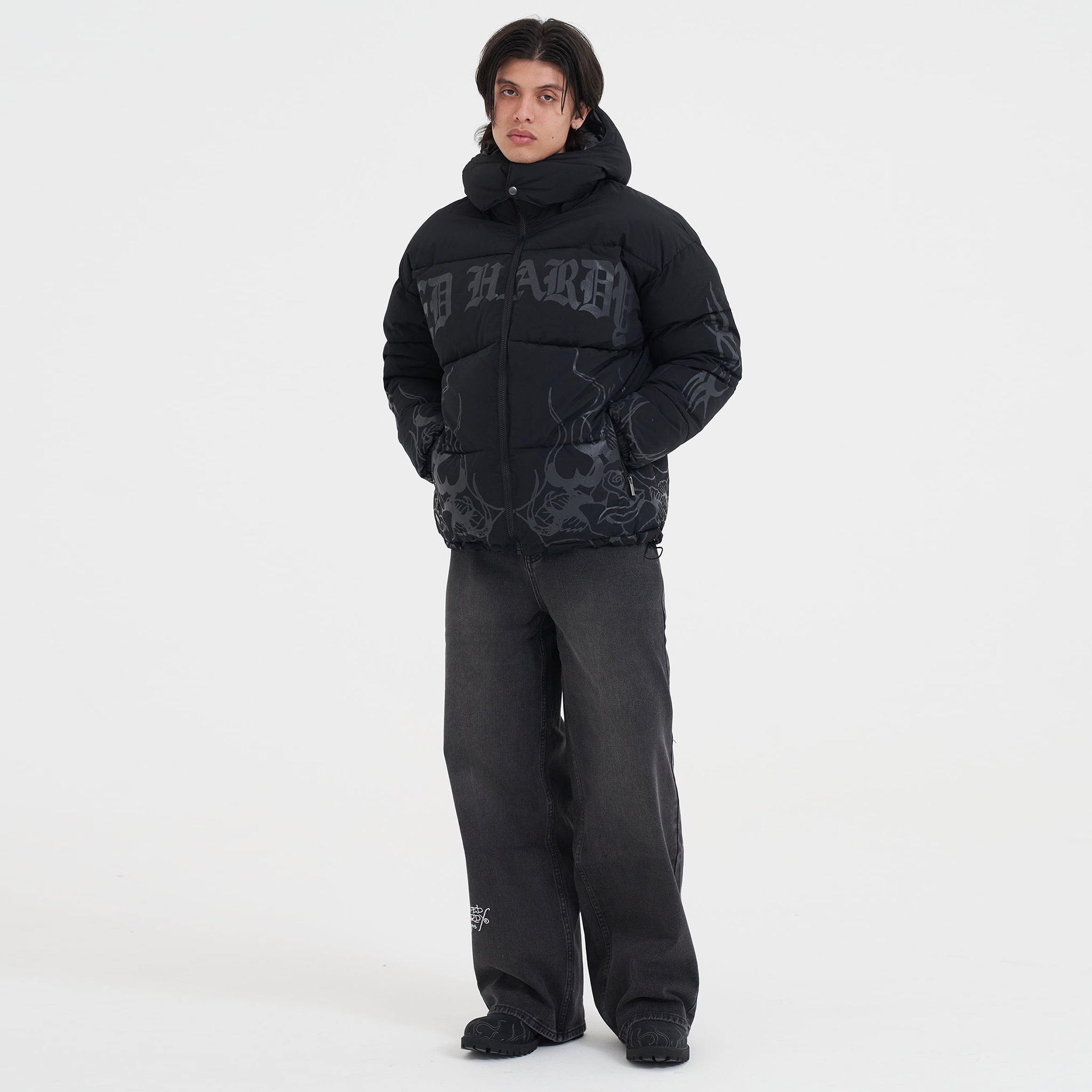Embrace versatility with the Flaming Rose Reversible Puffer Jacket in black. Designed for comfort and function, it features a reversible design, removable hood, and heavy-weight wadding for warmth. Adjustable elasticated hem and cuffs ensure a secure fit, while the Ed Hardy printed tattoo graphics add unique style. Crafted from durable nylon with polyester padding, this relaxed-fit coat combines practicality with bold fashion for your everyday needs.