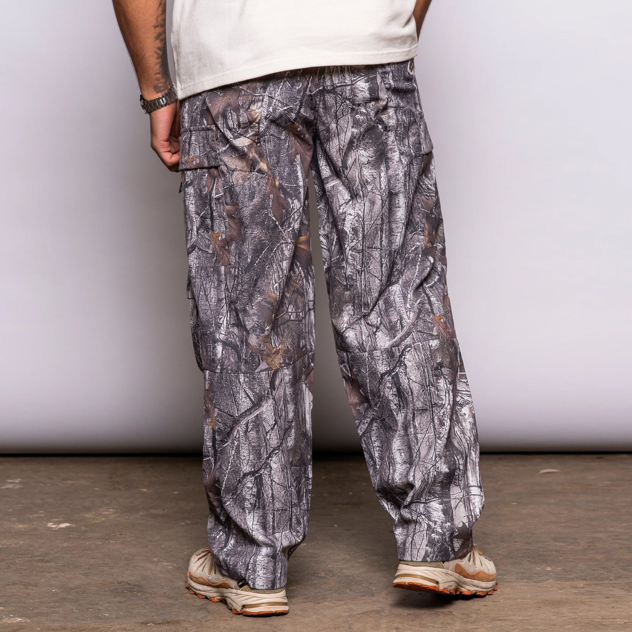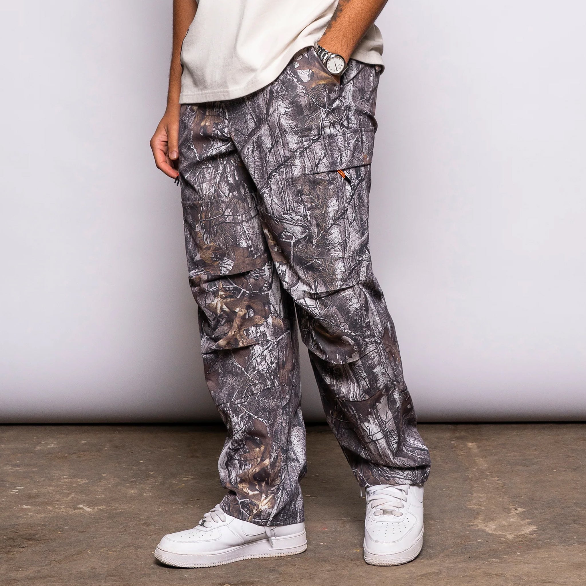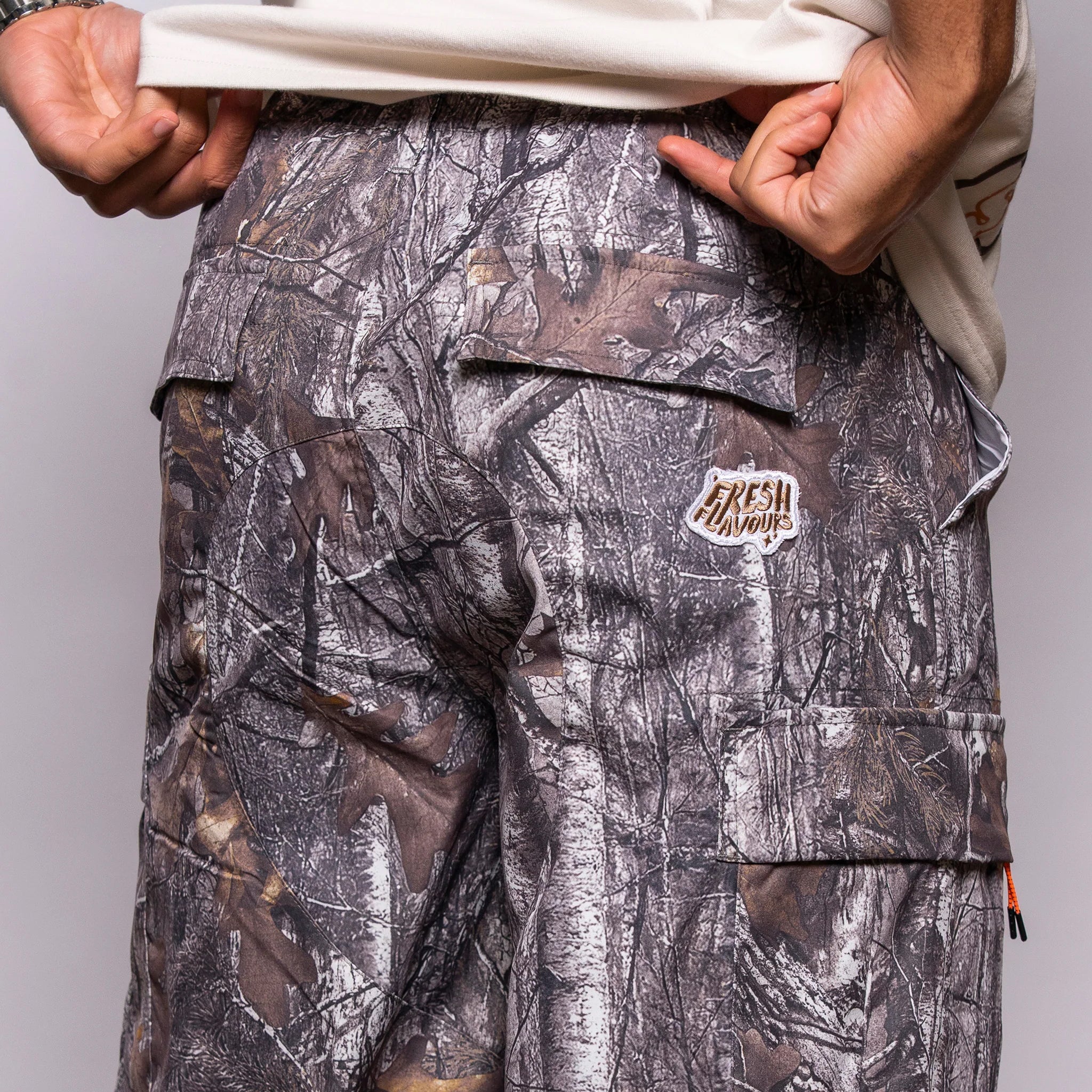 Fresh Flavours Cooked Up By Fresh Couture Woodland Camo Cargo Pants flip the script on classic camouflage—this isn't about blending in, it's about standing out. Crafted from 100% polyester, the all-over woodland camo print commands attention while oversized cargo pockets deliver serious functionality. Woven badge branding adds streetwear credibility to a piece that refuses to whisper. Bold, unapologetic, and built for those who make noise.