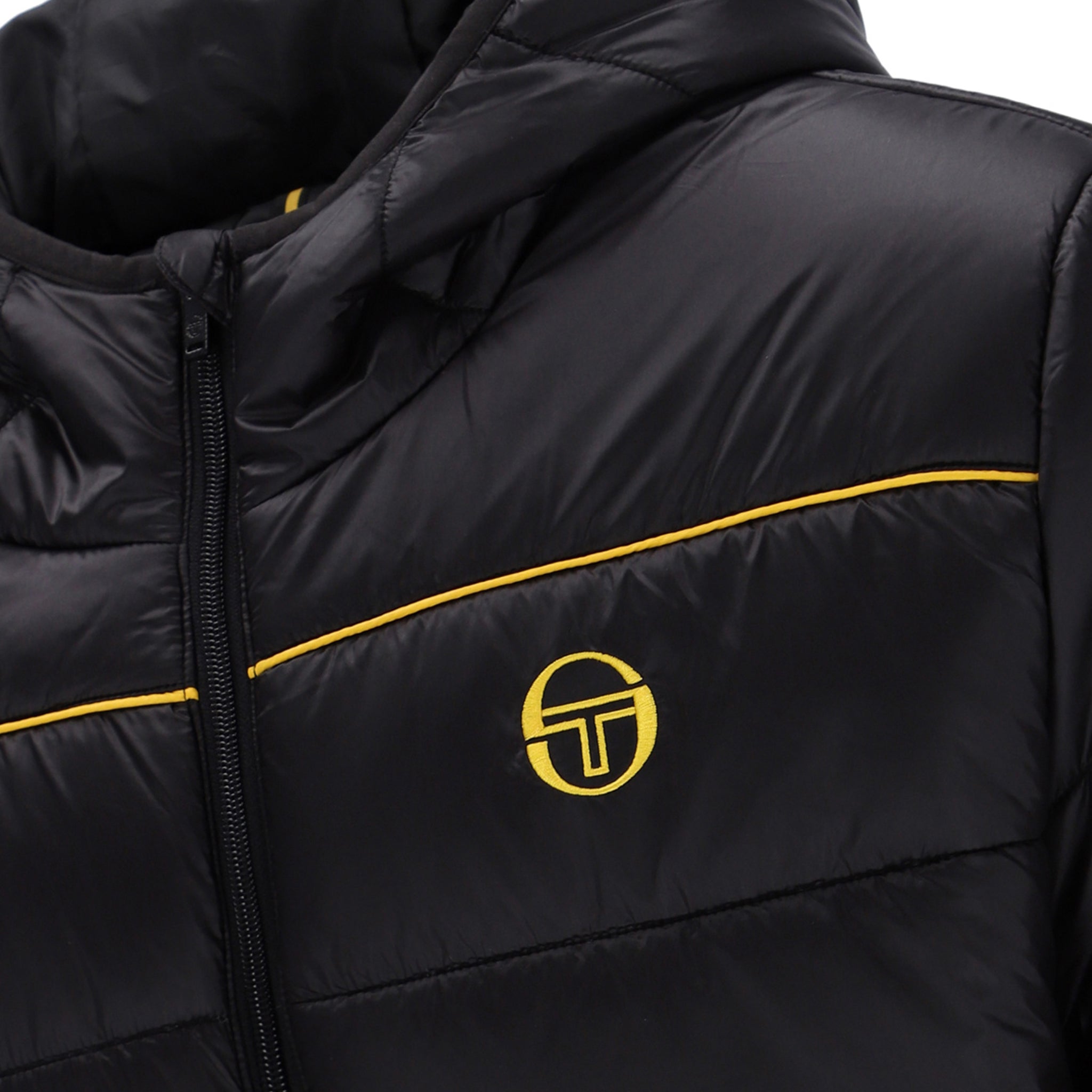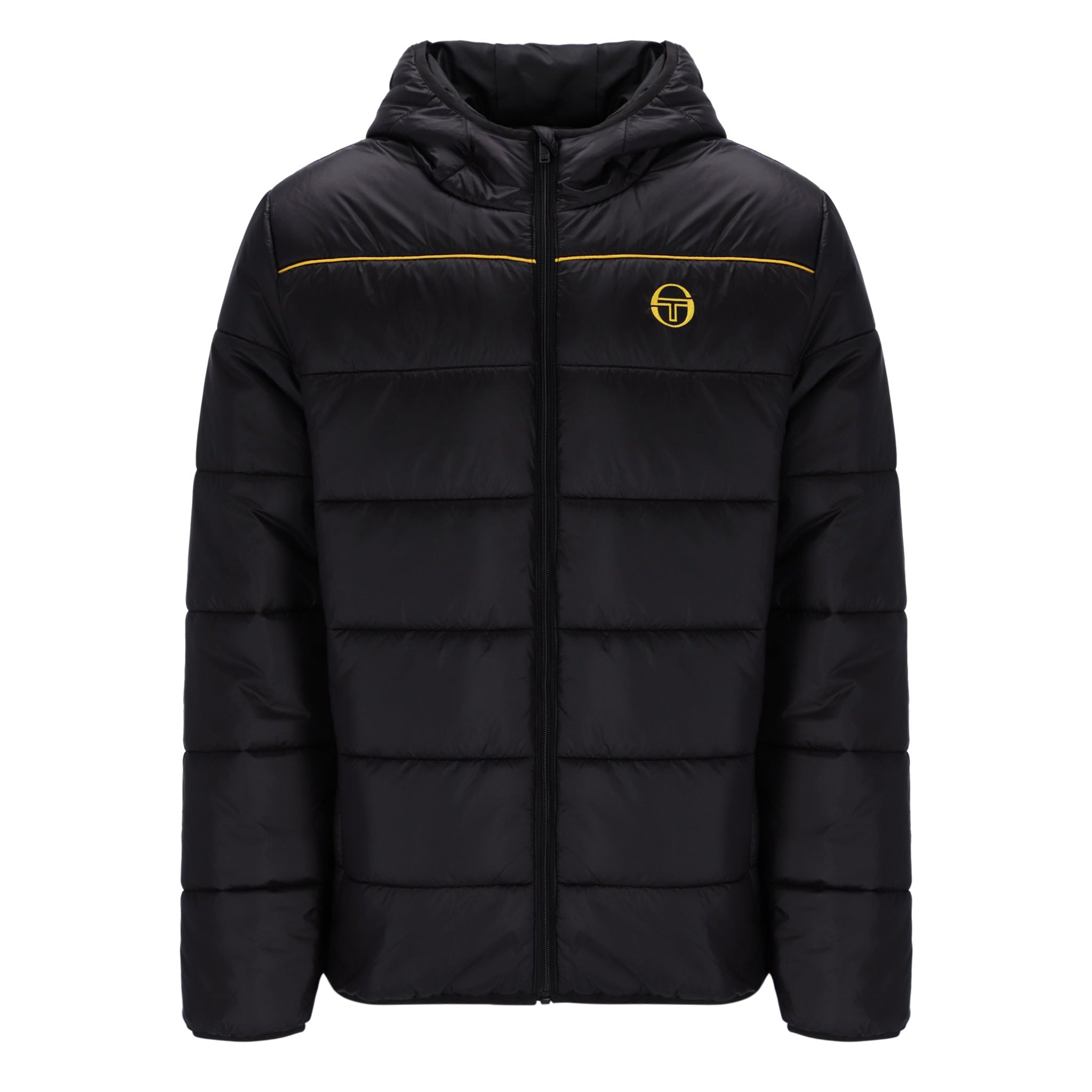The Sergio Tacchini Padova Puffer Jacket in black offers practical warmth with a fixed hood and lightweight wadding, keeping you comfortable without bulk. Its full front zip and contrasting piping provide a sleek, sporty look, while side zip pockets and an internal pocket ensure secure storage for essentials. Fully lined and made from durable nylon and polyester, this machine-washable jacket combines style and ease for everyday wear.