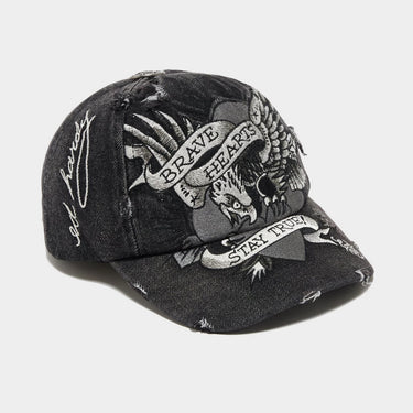 Embrace edgy style with this vintage-inspired 6-panel adjustable trucker cap, featuring a soaring eagle and heart embroidery that captures bold, timeless design. Subtle distressing adds authentic character, while Ed Hardy branded detailing and quality metal hardware complete the look. Crafted from 100% cotton for breathable comfort all day long. Perfect for those who appreciate classic streetwear aesthetics with an edge.