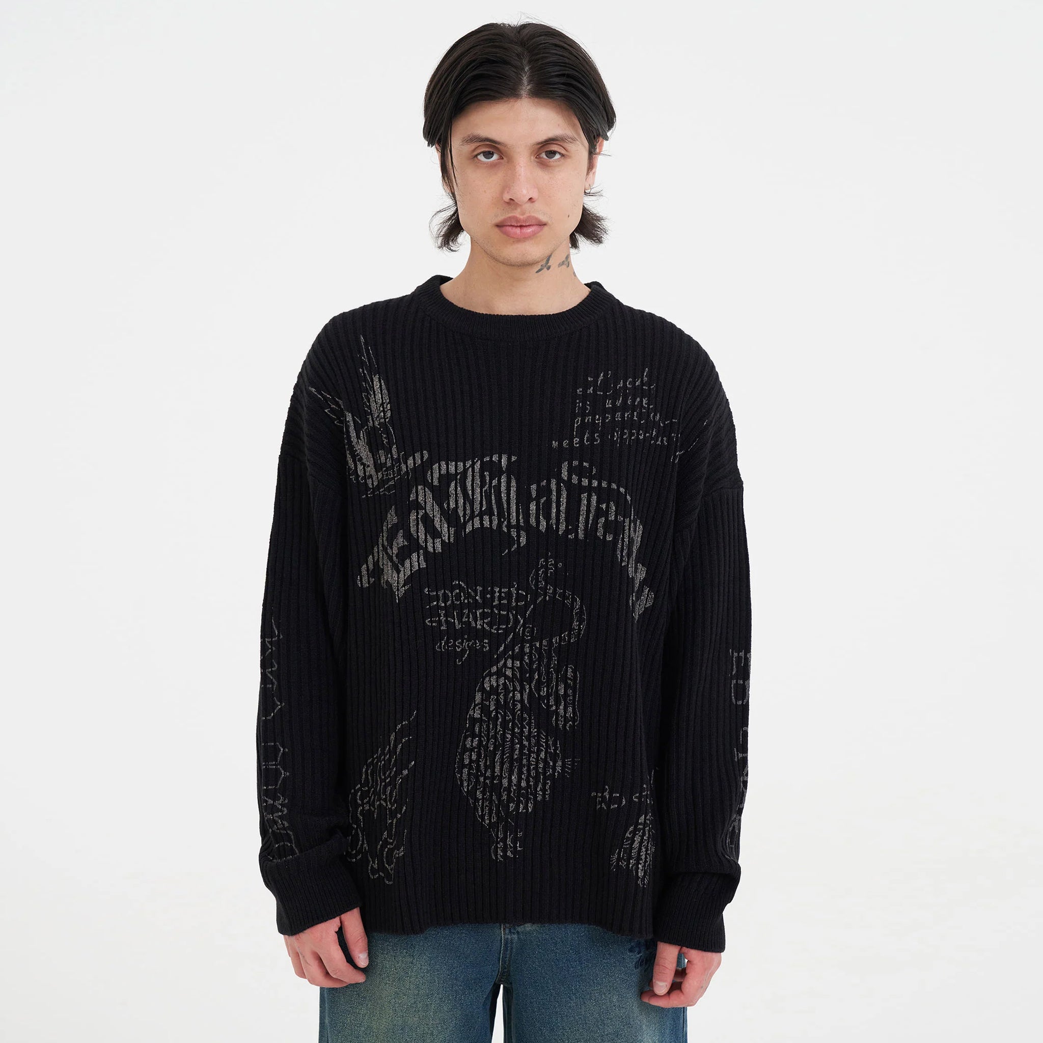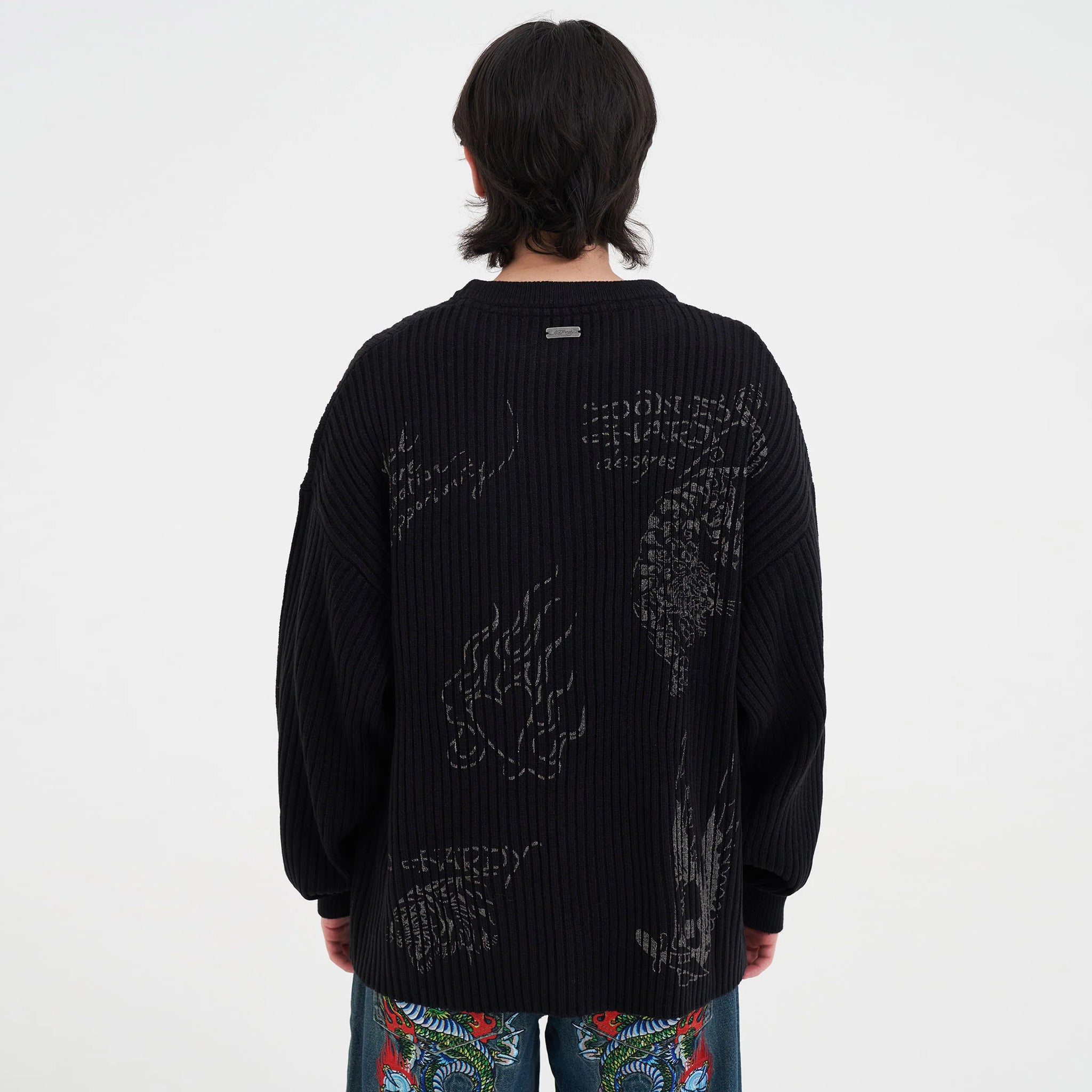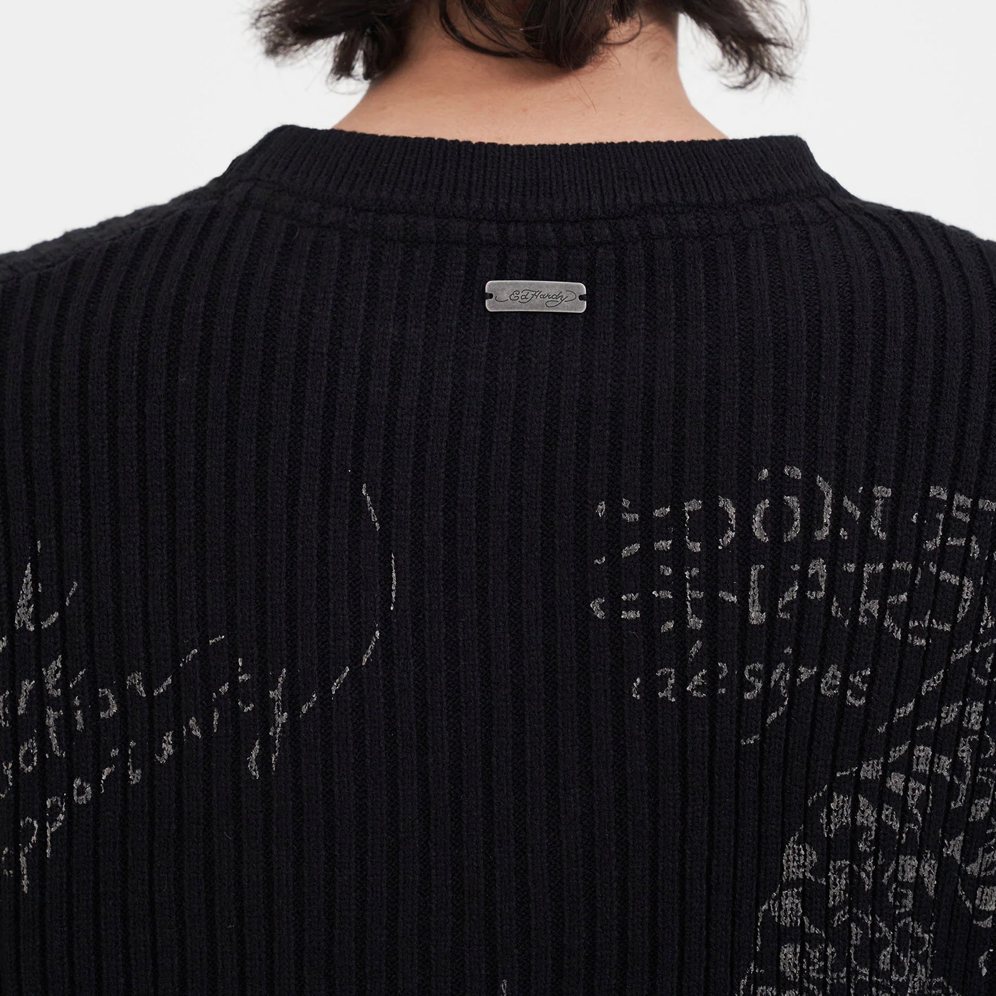 This Gothic Ribbed Knit Jumper in black offers a relaxed fit for comfortable all-day wear. Crafted from a soft blend of 70% acrylic and 30% wool, it combines warmth and durability. Featuring distinctive Ed Hardy multi graphic prints and a subtle metal tab at the center back neck, this jumper adds a bold, stylish edge to your wardrobe while keeping you cozy.